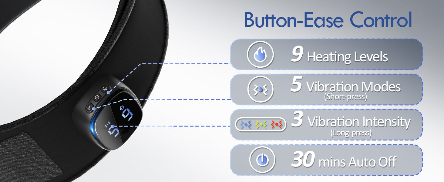 Featuring four adjustable massage and heat intensity levels, the device allows you to personalize your experience based on your comfort needs—whether you need gentle warmth or deep, soothing relief. The intelligent digital touch screen ensures effortless operation, enabling quick adjustments without interrupting your relaxation.